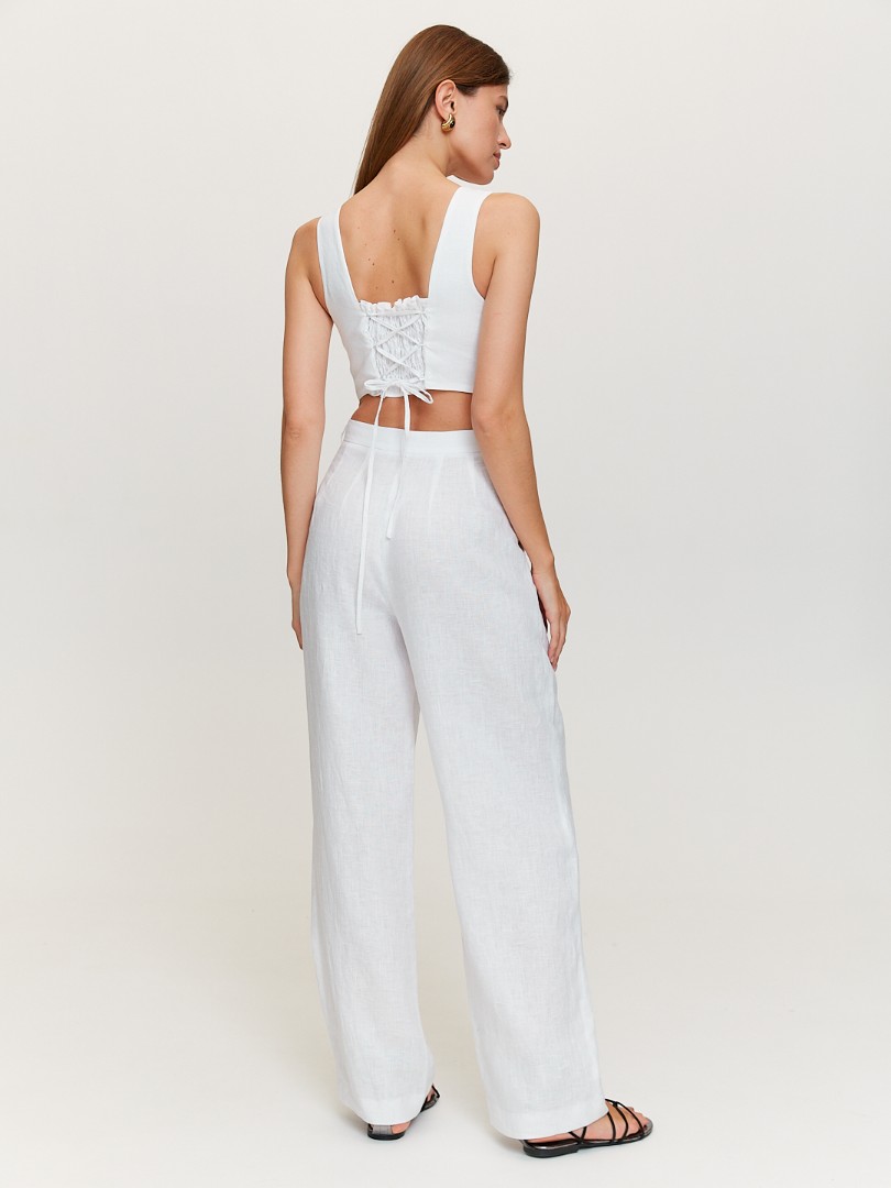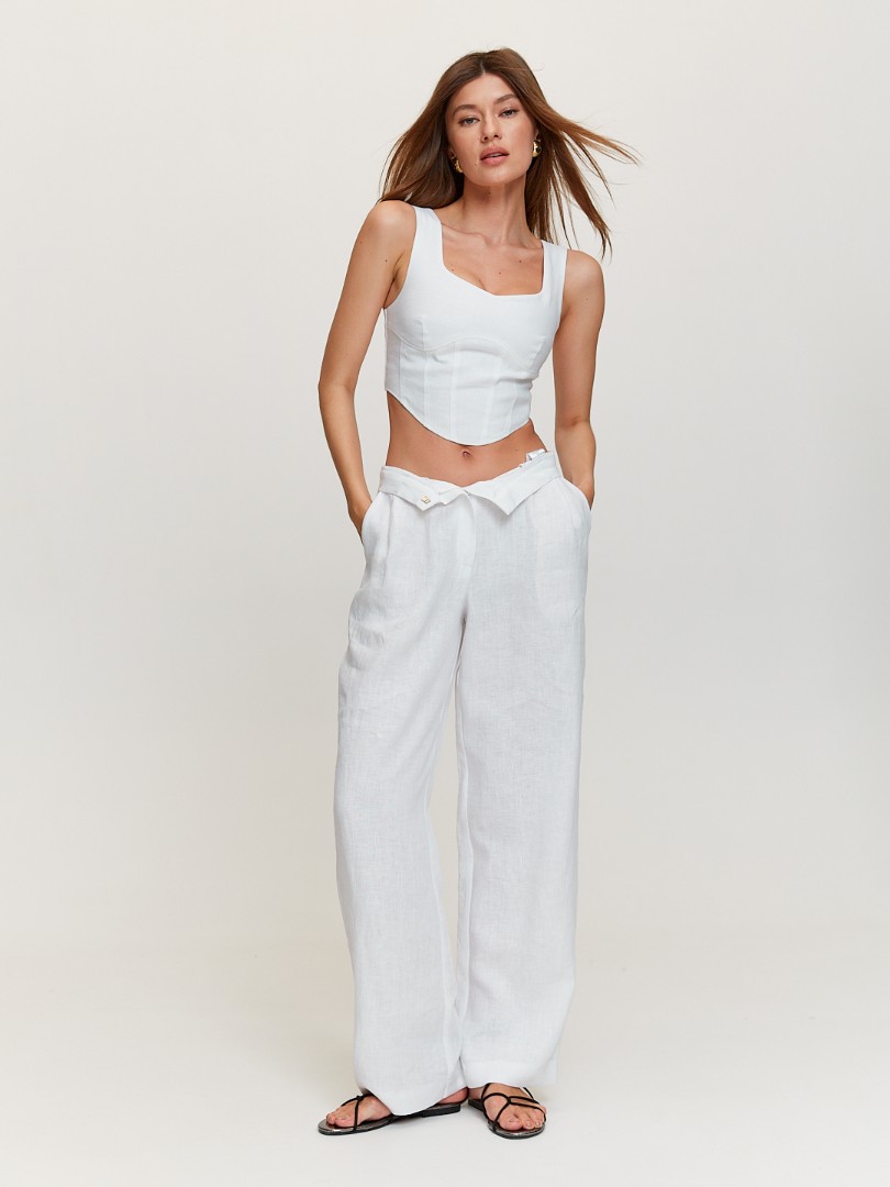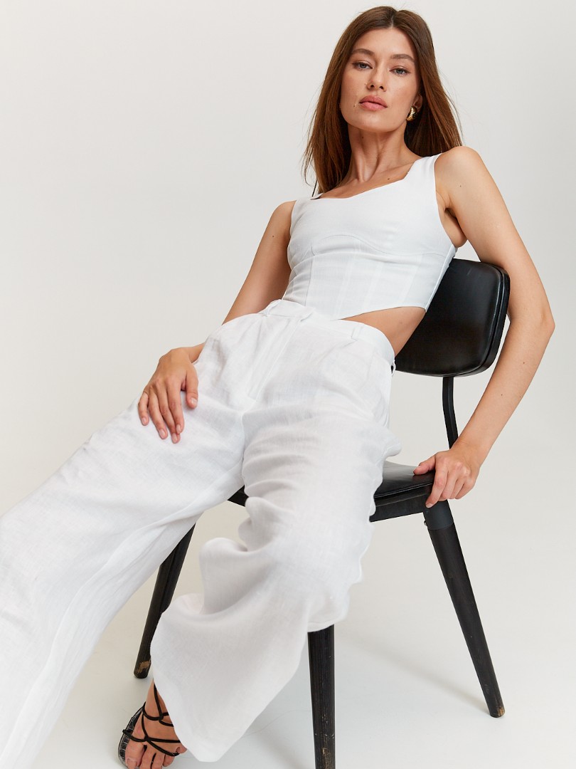 Нали палаццо сидят прямо на талии, что прекрасно ее акцентирует, и затем прямыми линиями они нисподают до самого пола. По переду расположены два защипа, что даст Вам сводобы и удобства в бёдрах, но ни в коем случае не утяжелят и не увеличат их.