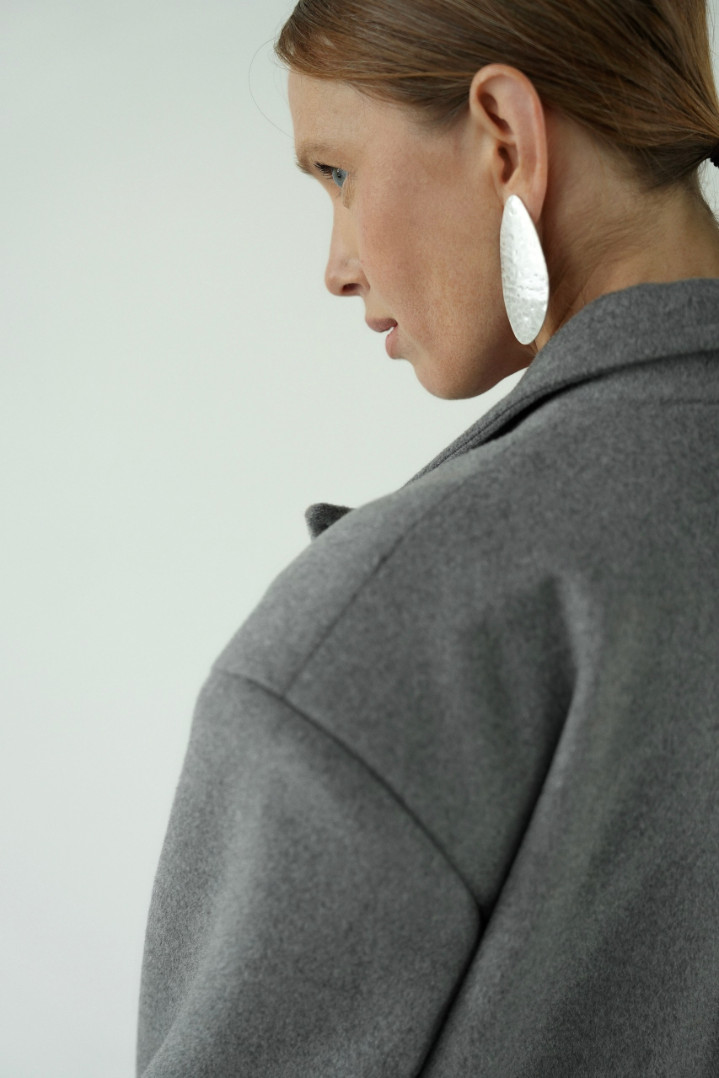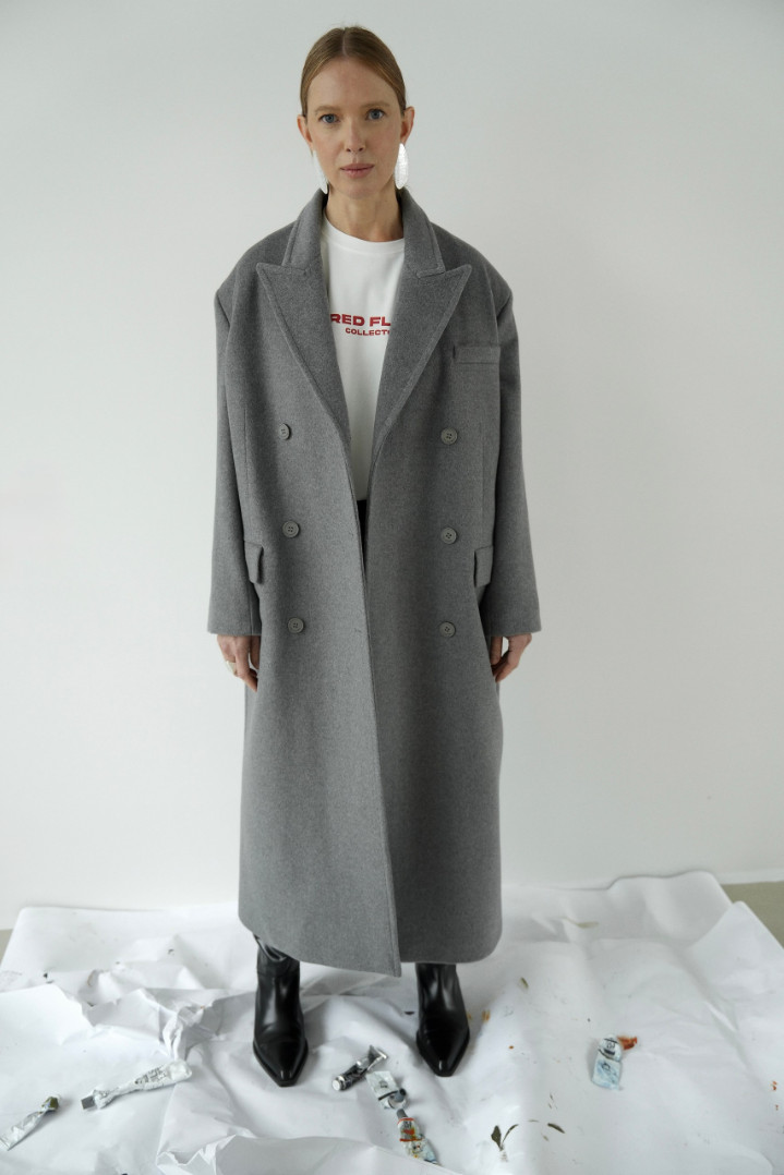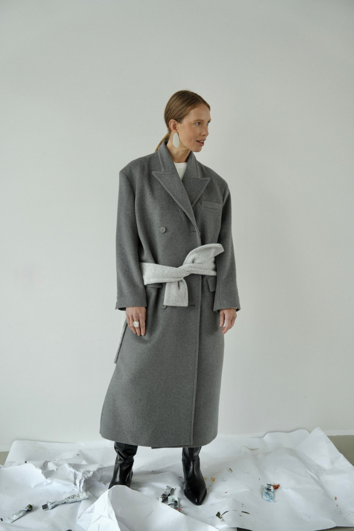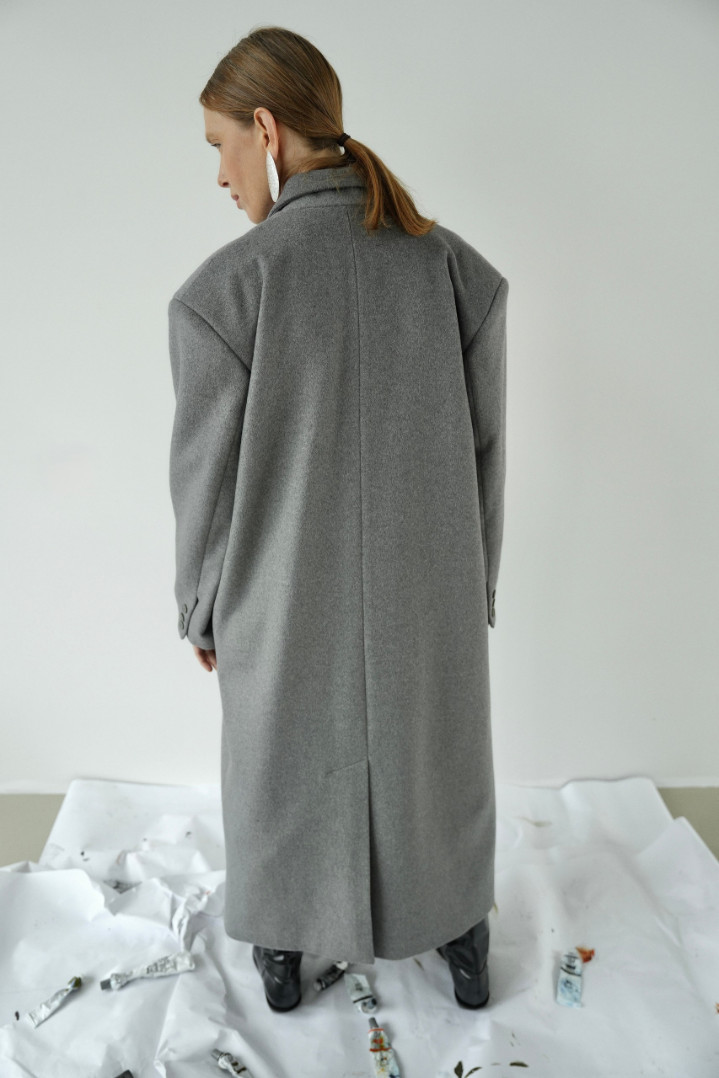 Пальто макси из шерсти. Спущенная линия плеча и умеренный овер делает его комфортным и несковыающим движения. Акцентные лацканы добавляют образу дерзости.