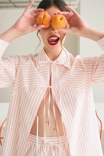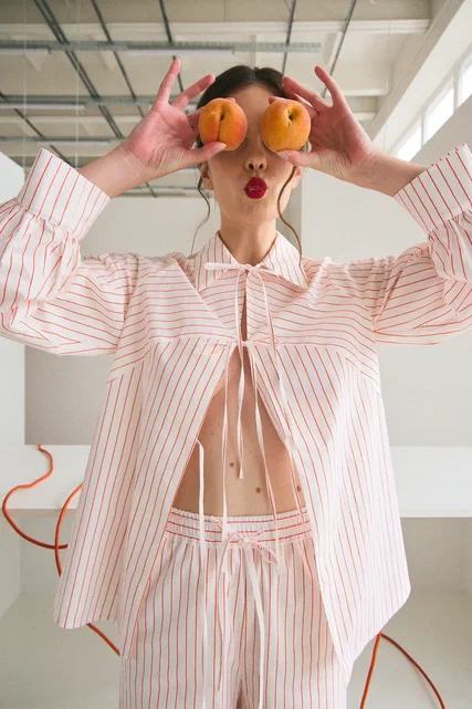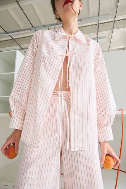 Свободная рубашка с рукавом реглан и мягким отложным воротником про комфорт с выразительными деталями. Сборка по низу рукавов создаёт объём и лёгкую фактуру. Вместо привычных пуговиц три изящные завязки по центру переда, добавляющие образу игривости и свободы