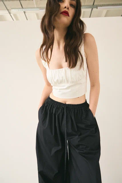 Молочный топ прилегающего силуэта с акцентом на детали. Квадратный вырез подчёркивает линию шеи и ключиц, а декоративная сборка по лифу и бретелям добавляет мягкости образу. Топ идеально сочетается с юбкой баллон из коллекции