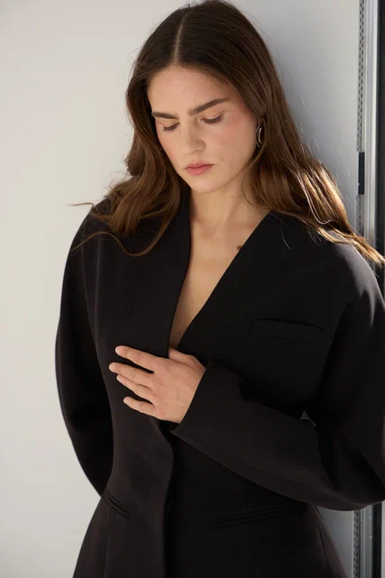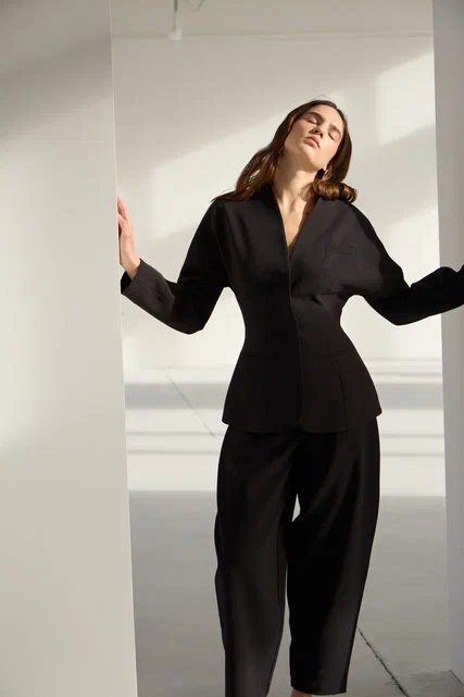 Жакет "Кимоно" с акцентом на талии - для женственных и стильных образов. Выполнен из плотного материала, который хорошо держит форму. Имеет потайную застежку из трёх пуговиц.