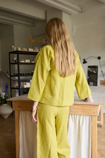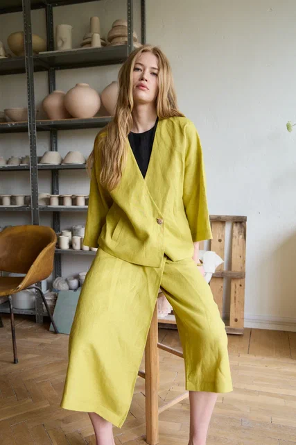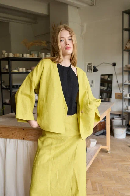 Жакет свобоного силуэта, с расширенным и спущенным рукавом с двубортной застежкой на одну пуговицу(и одну потайную), справа карман с листочкой. Стан изделия на подкладке.