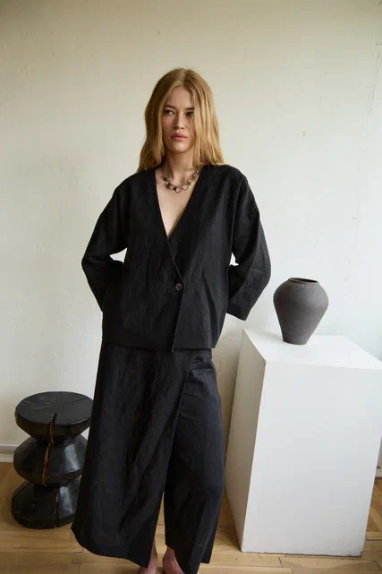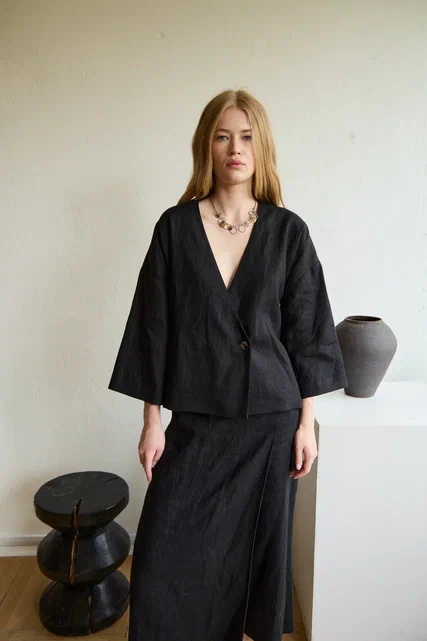 Жакет свобоного силуэта, с расширенным и спущенным рукавом с двубортной застежкой на одну пуговицу(и одну потайную), справа карман с листочкой. Стан изделия на подкладке.