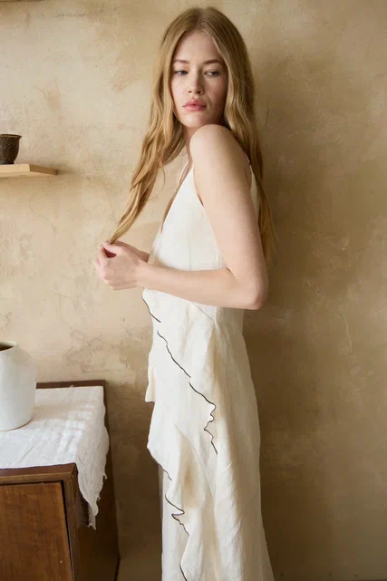 Платье полуприлегающего силуэта длиной до середины икры, с диагональными рельефами по переду и воланами в них, полевой ноге сбоку разрез, края воланов и низов обработы контрастной "закруткой". Модель на подкладке, на регулируемых бретелях и с застежкой на потайную молнию по спинке
