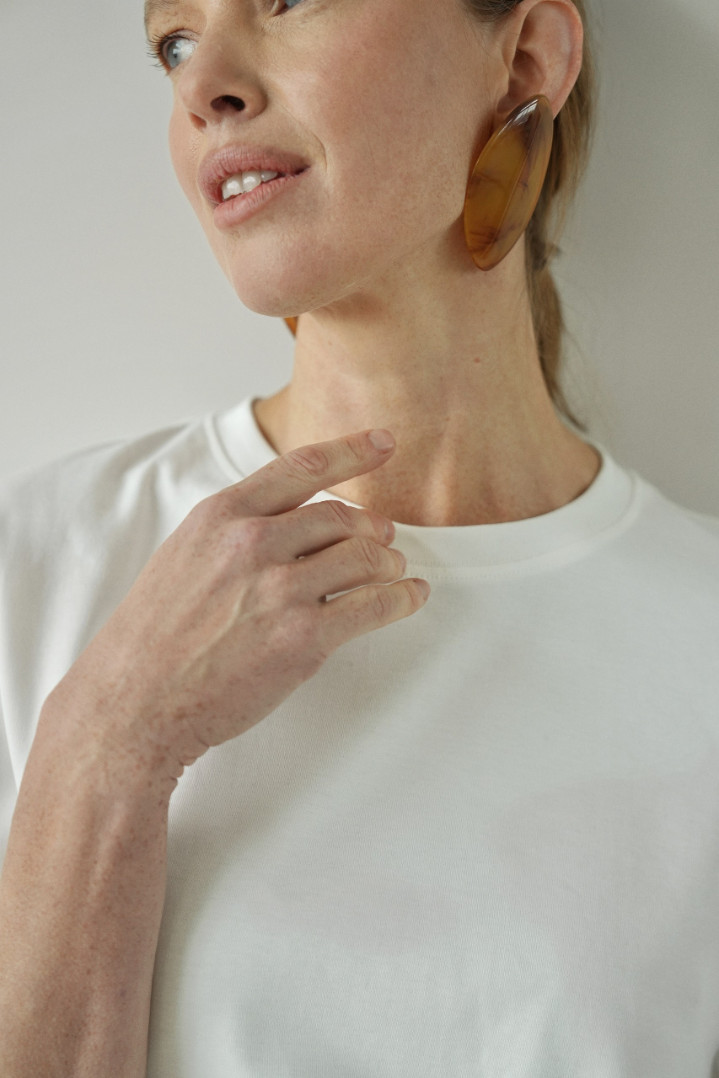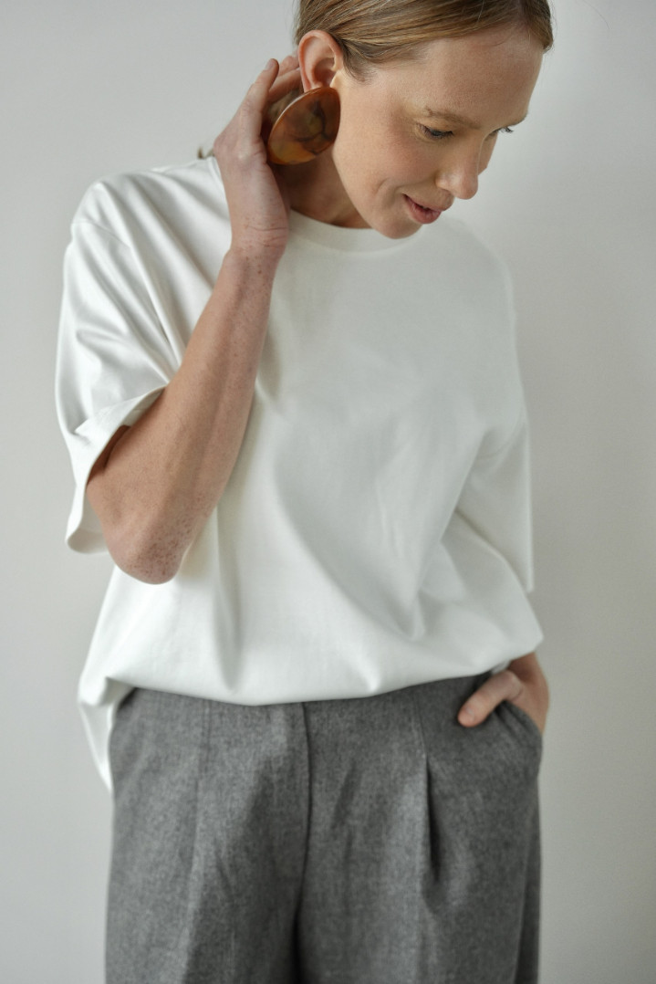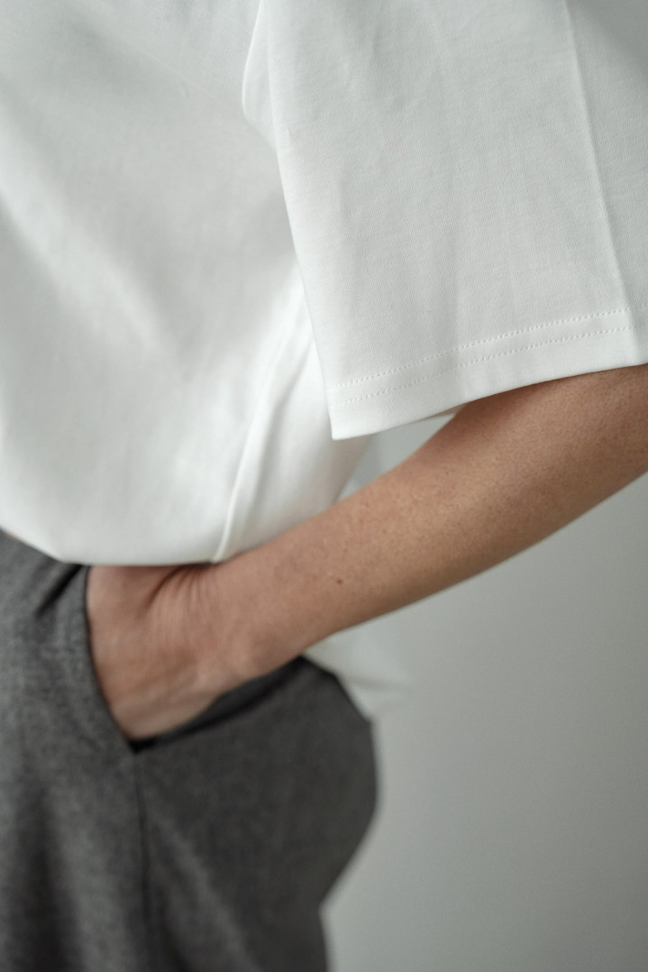 Базовая белая футболка из плотного хлопка, который идеально держит форму. Must have в любом гардеробе.