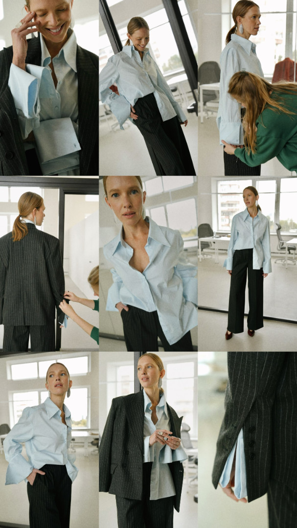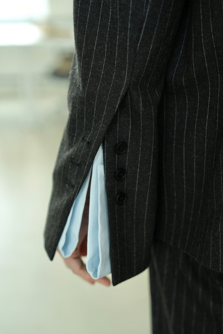 Пиджак из плотной шерсти в полоску будет идеален для ваших деловых встреч, где вы будете решать судьбы многомиллионных контрактов. Костюм из этой ткани точно должен быть у каждой selfmade woman. Плотная шерсть и тенсел добавляют образу структуру и мягкость одновременно, так же, как ваша харизма сочетает строгость и легкость.