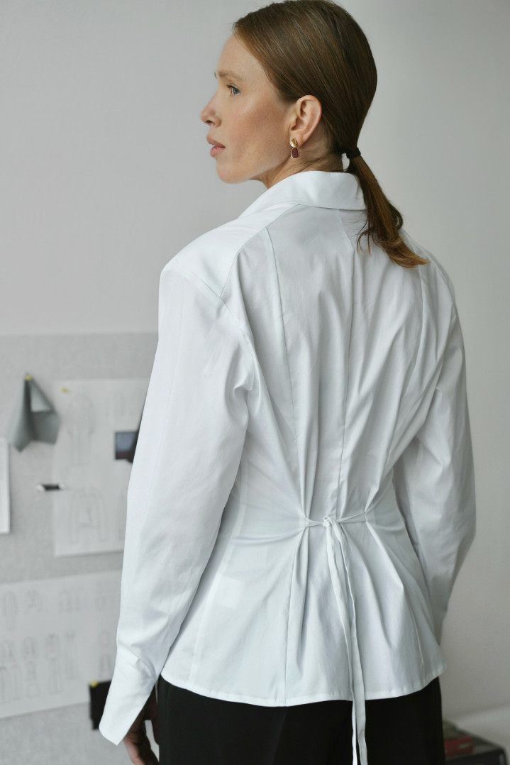 Рубашка полуприлегающего силуэта с завязками по спинке, которые красиво подчеркнут линию талии. Идеально с брюками палаццо или юбкой карандаш