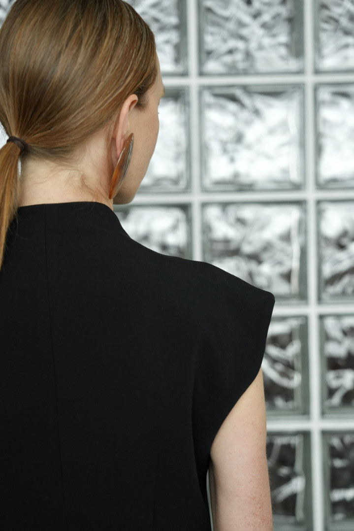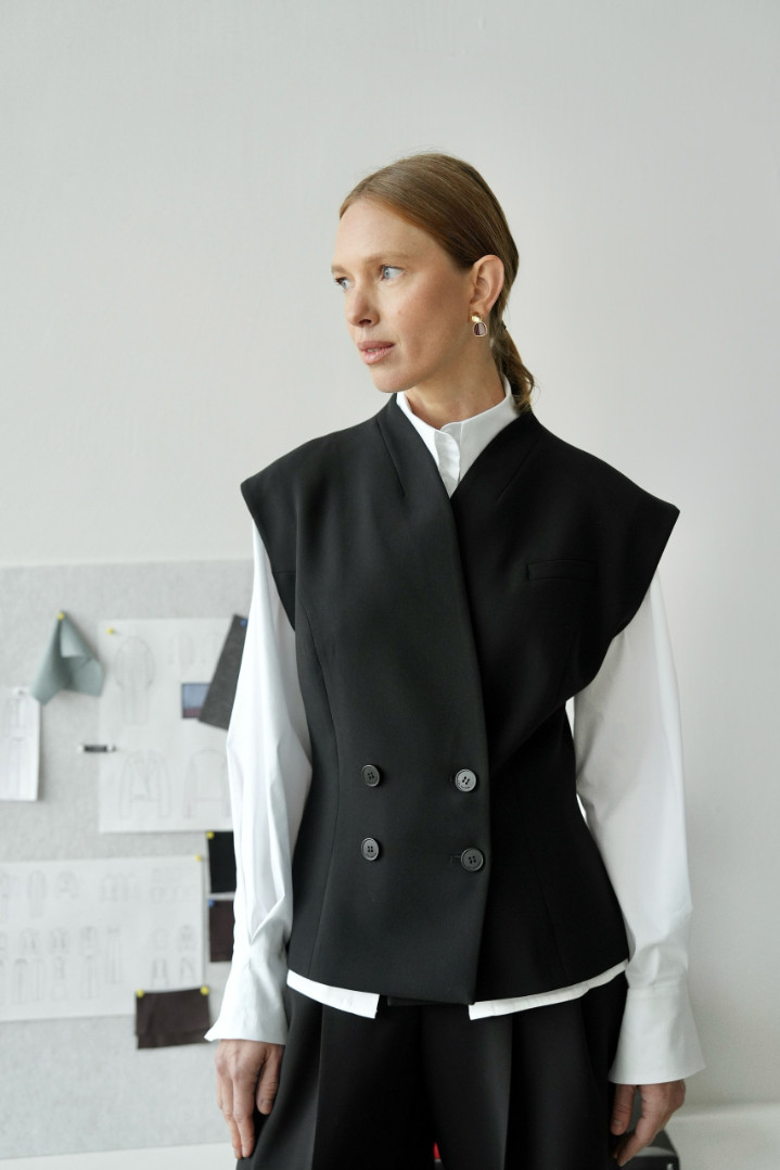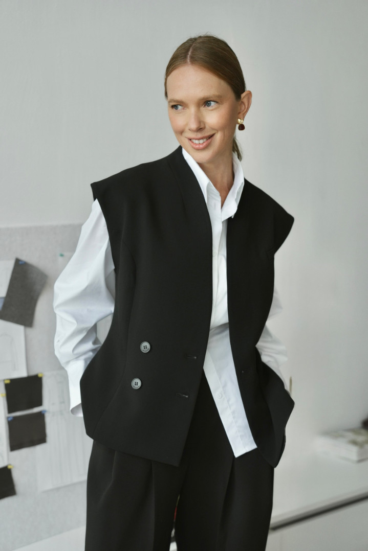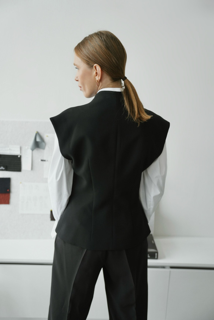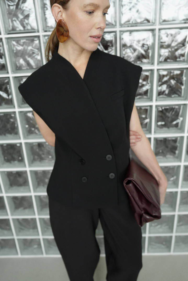 Жилет полуприлегающего силуэта и с двубортной застежкой. Красиво подчеркнет талию, длина плечиков закрывает подмышечную зону и позволяет носить жилет без нижнего слоя, а также с рубашкой или лонгом под низ.