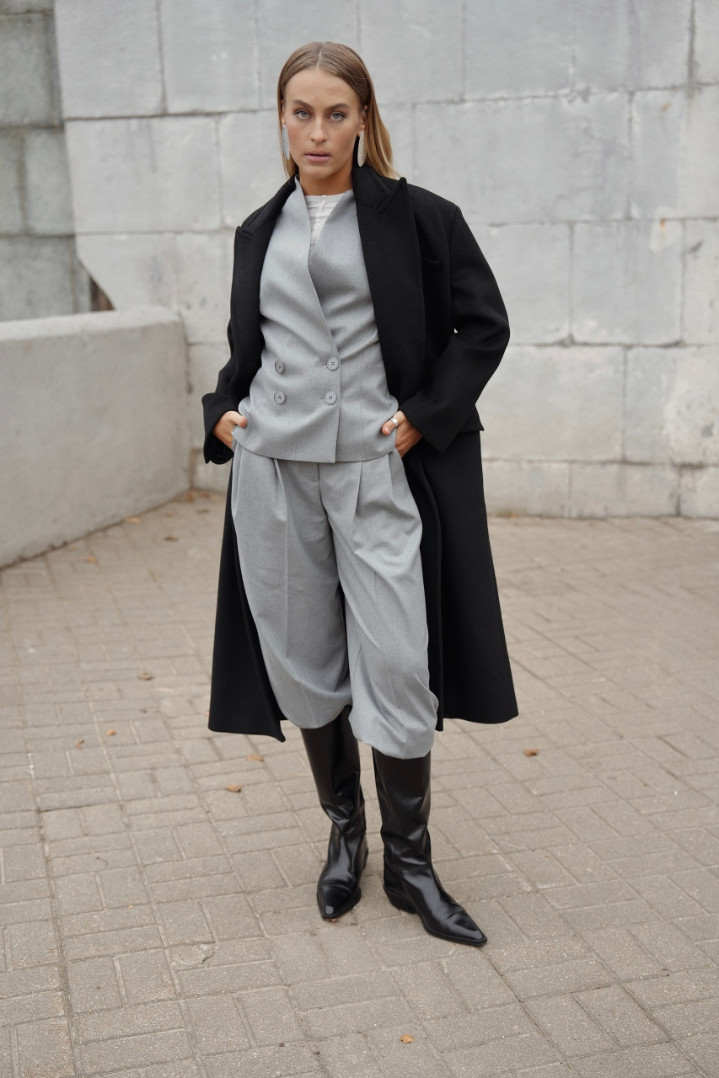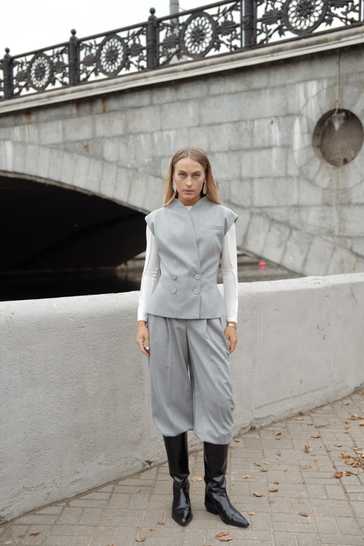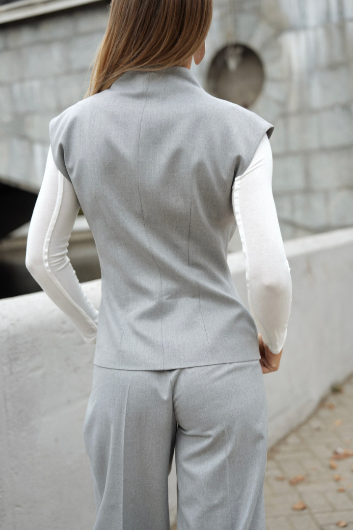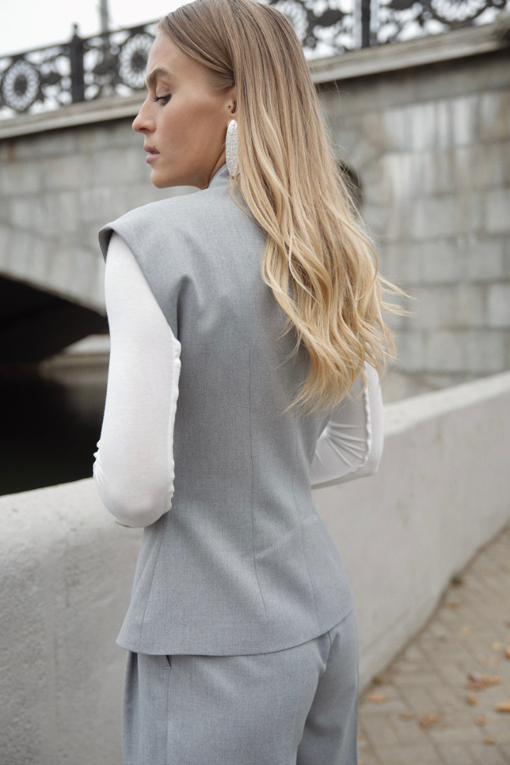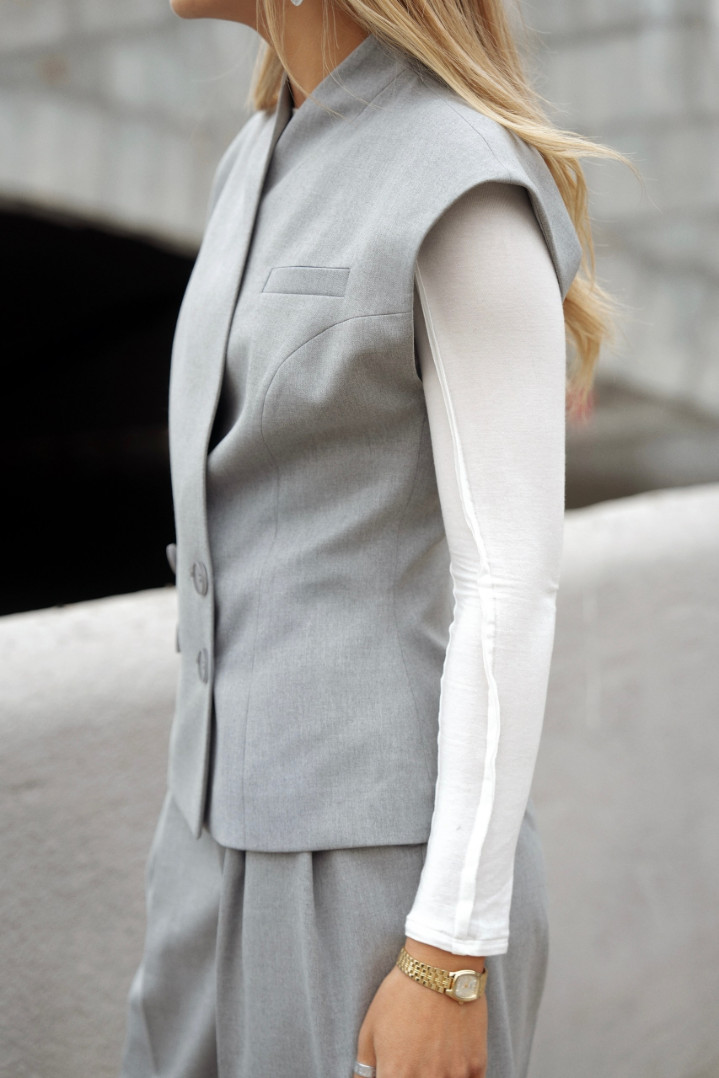 Жилет полуприлегающего силуэта и с двубортной застежкой. Красиво подчеркнет талию, длина плечиков закрывает подмышечную зону и позволяет носить жилет без нижнего слоя, а также с рубашкой или лонгом под низ.