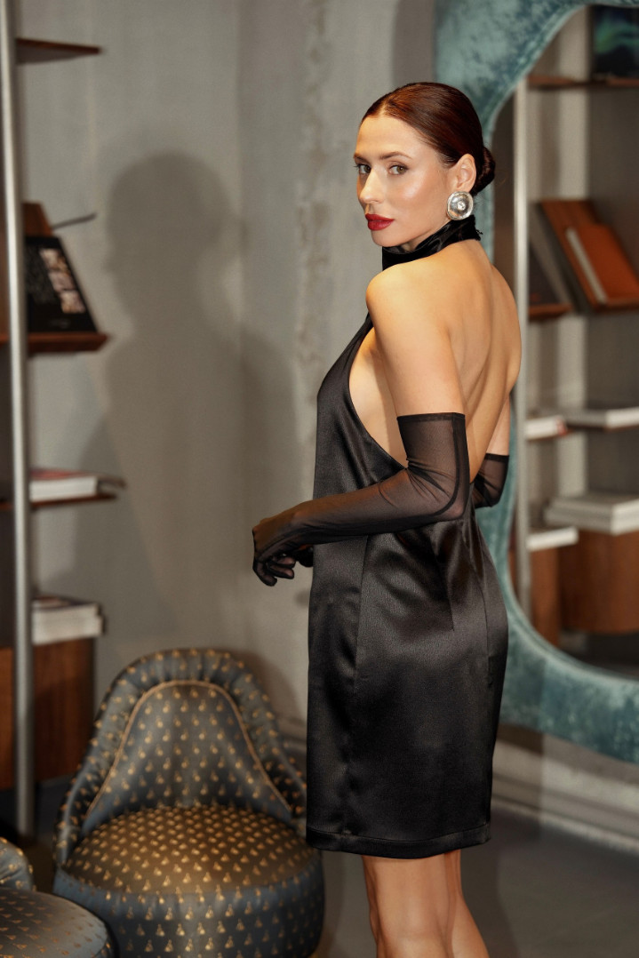 Платье с высокой стойкой и открытой спиной создаёт идеальный баланс между сдержанностью и чувственностью. Выполнено из итальянской ткани с шелком в благородном оттенке «шампань», платье мягко облегает фигуру, подчеркивая естественные линии. Глубокий вырез на спине становится главным акцентом,