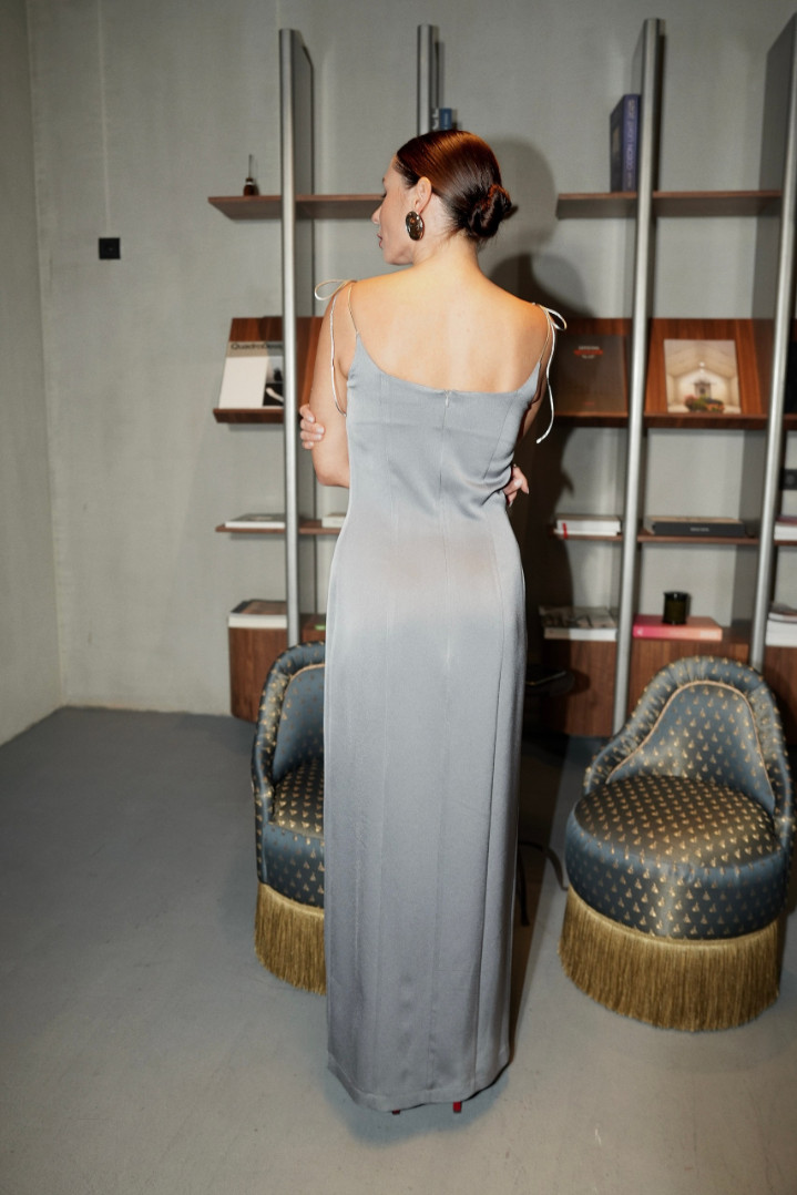Струящийся силуэт, воплощающий идеал скульптурной элегантности. Вертикальные линии плавно вытягивают фигуру, создавая утонченный образ-статуэтку, а тонкие бретели с изящной завязкой подчеркивают хрупкость лифа. Легкая игра разрезов вносит ноту непринужденной игривости.
