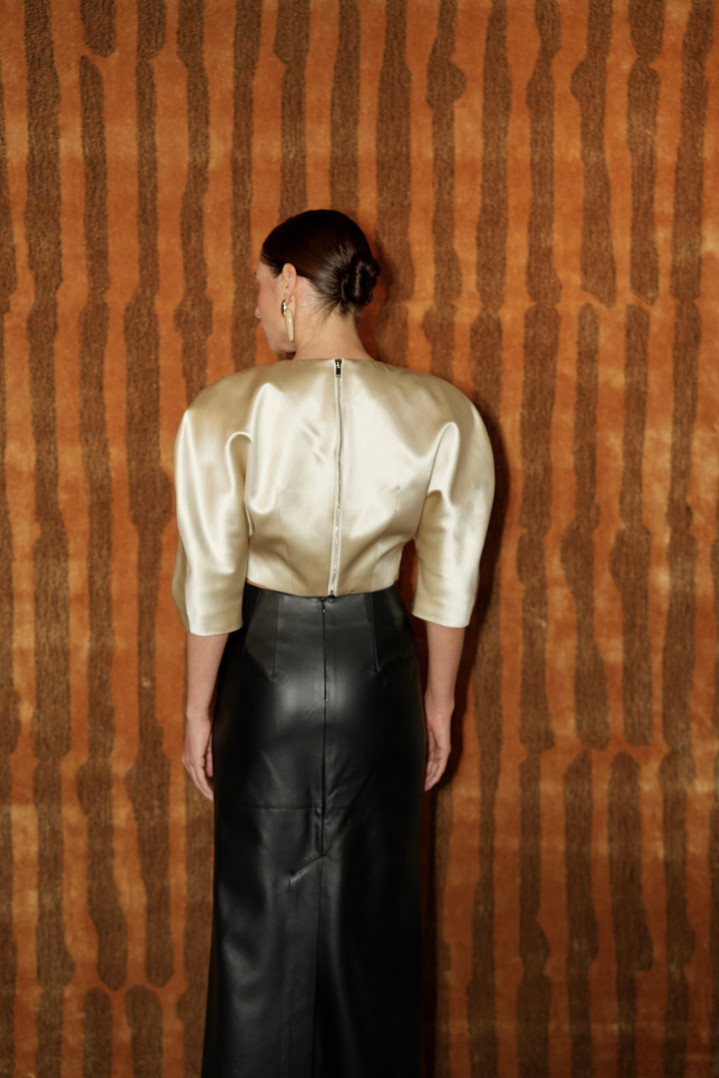 Топ с мягким округлым рукавом создаёт изящный силуэт с акцентом на красивой линии плеч. Выполненный из итальянского шёлка, он сочетает лёгкость и структуру — идеально комбинируется с кожаной юбкой для дерзкого контраста или с брюками-палаццо для струящегося образа.